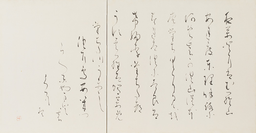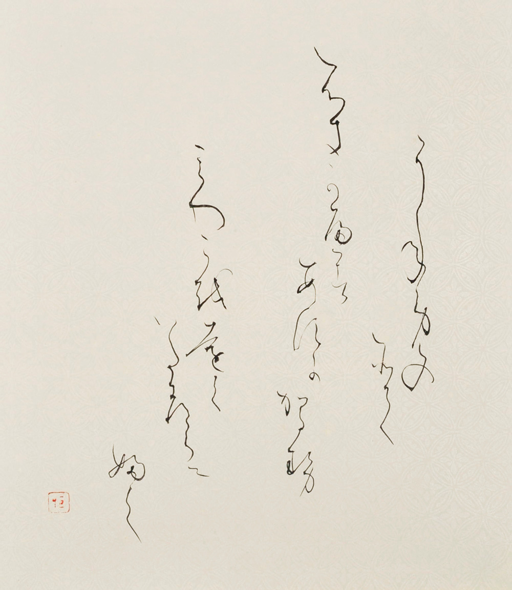 Sa partikular, binigyang-pansin ni Tsuneko ang nakakalat na pagsulat sa "Tsugishikishi," na iginagalang niya bilang "isang pino at marangal na istilo ng pagsulat na angkop sa isang matandang calligrapher" (Tandaan 3). Sa kana calligraphy, ang "scattered writing" ay isang pamamaraan ng pagpapahayag ng calligraphy na gumagamit ng white space sa pamamagitan ng pag-aayos at pagbubuo ng mga character. Ang "Tsugishikishi" ay nailalarawan sa pamamagitan ng magandang paggamit ng espasyo, dahil ang iba't ibang piraso ng papel ay pinagsama-sama upang magsulat ng isang tula ng waka.